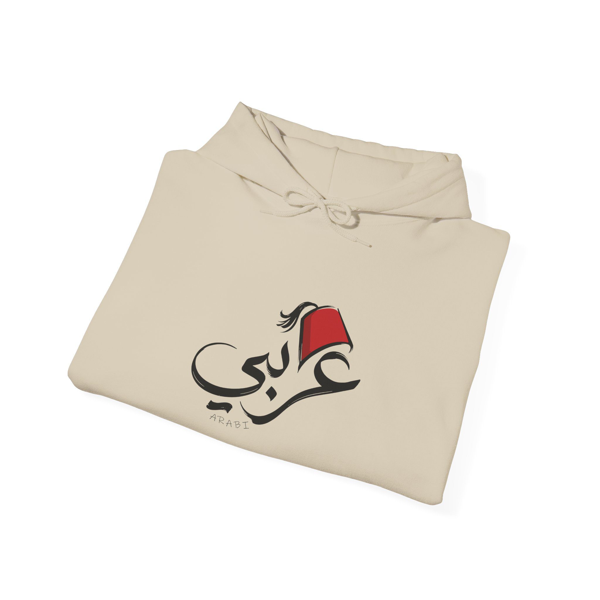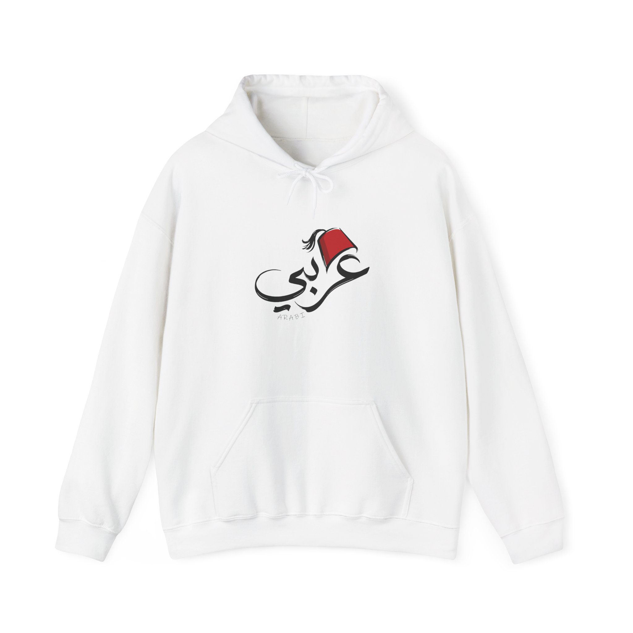 At the center of the hoodie is the Arabic word “عربي” (Arabi), styled in an elegant contemporary lettering design. Above the lettering sits a red tarboosh, a traditional symbol closely tied to Arab heritage and culture. The mix of modern typography with this iconic cultural element creates a design that feels proudly Arab.