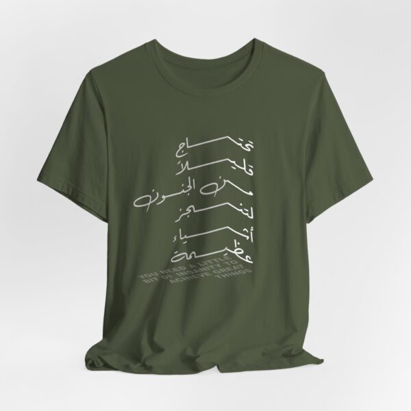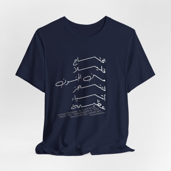 Unique Arabic calligraphy t-shirt. “You need a little bit of insanity to achieve great things,” styled with a 3D cube shape and lightning edges. A motivational Arabic t-shirt for fearless dreamers.