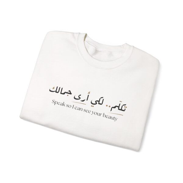 A poetic Arabic quote sweatshirt that says “تكلم.. لكي أرى جمالك” meaning ‘Speak So I Can See Your Beauty’ in English, artfully styled in traditional Arabic calligraphy, with two carefully underlined Arabic words “تكلم/speak” and “أرى/see” – that draw attention to its poetic meaning.