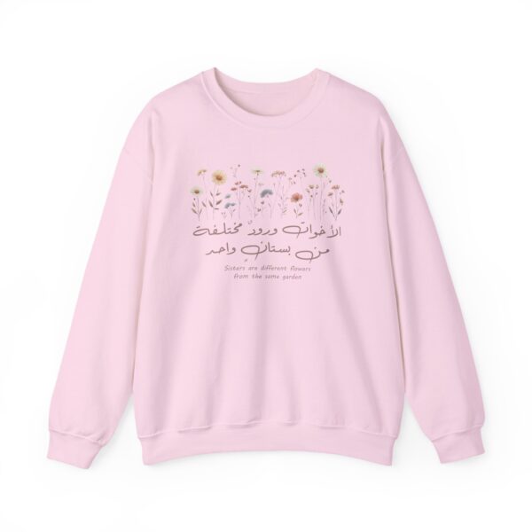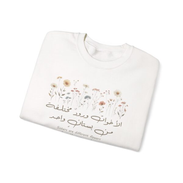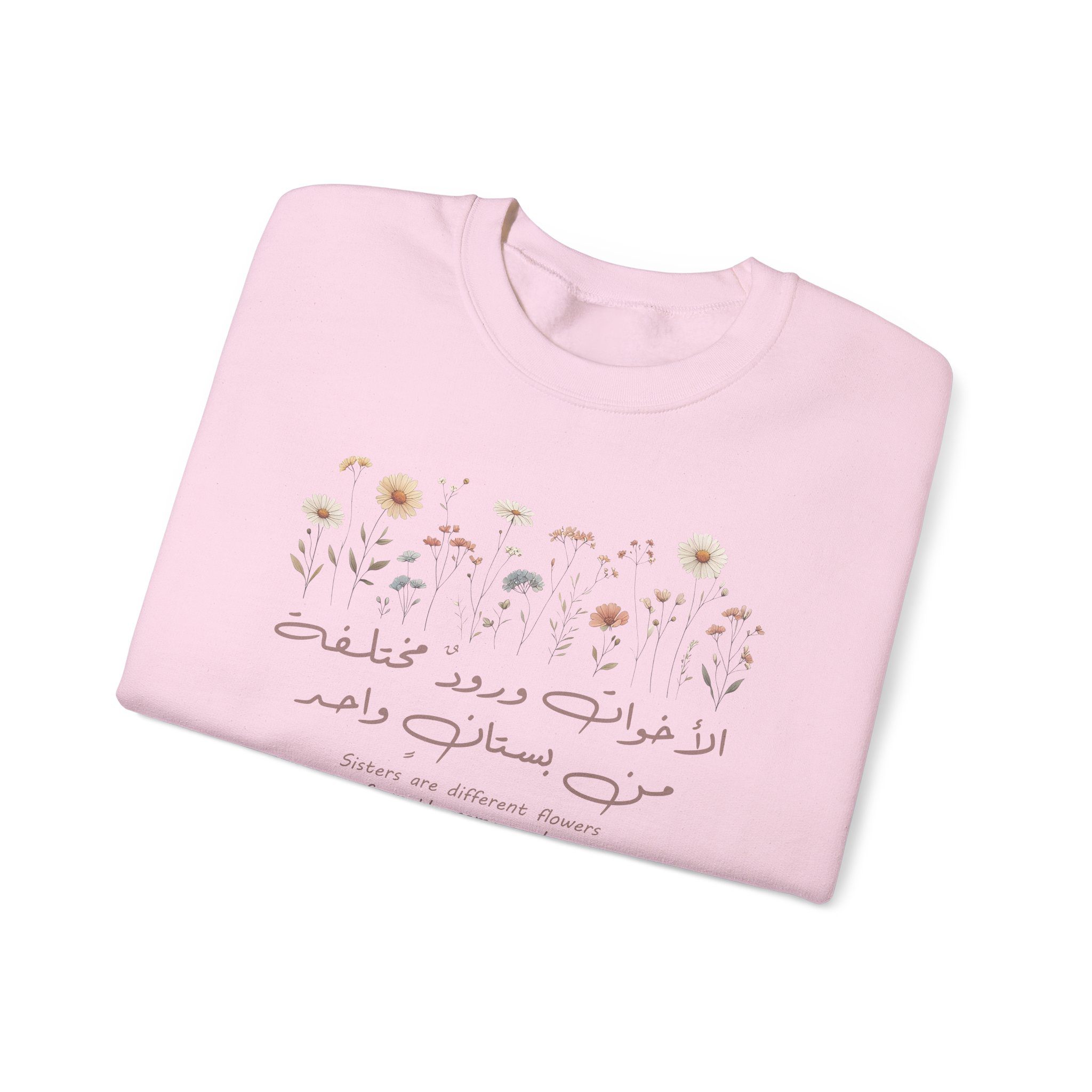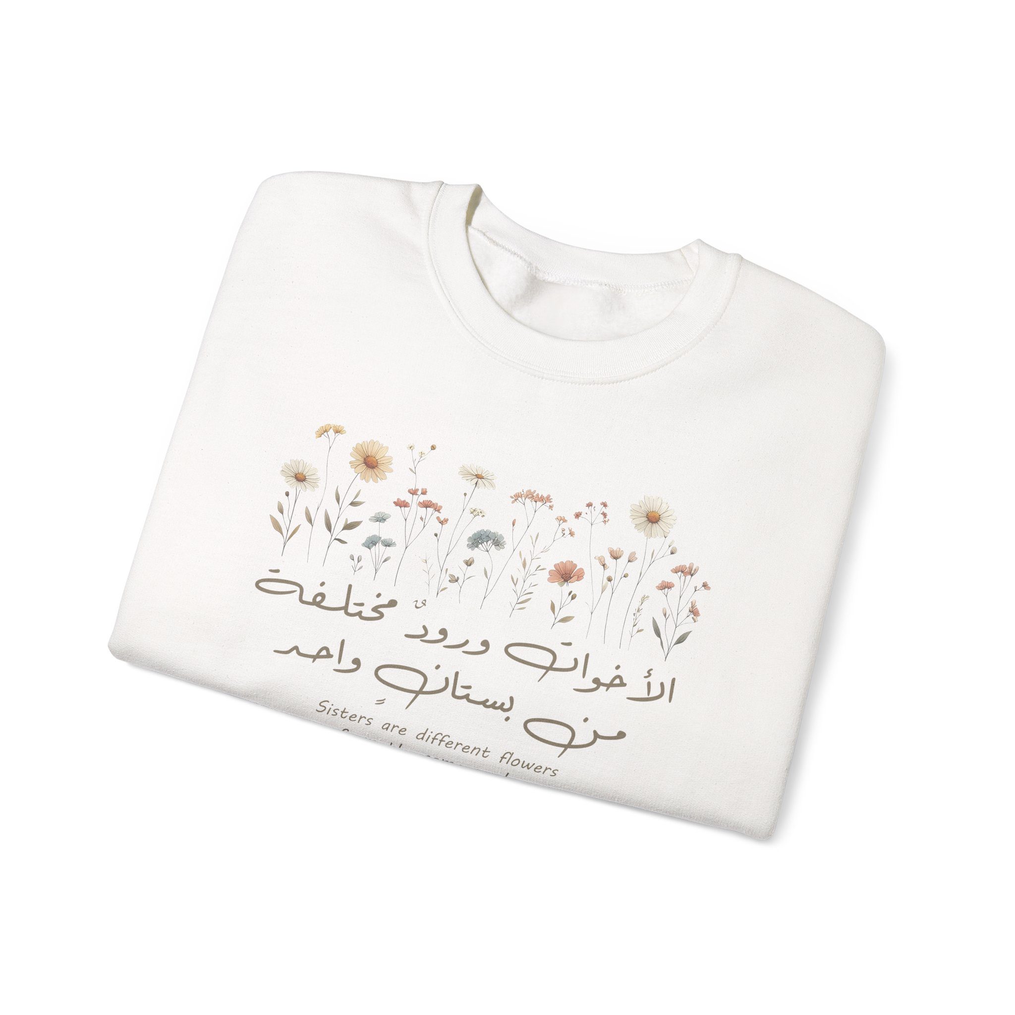 This Arabic sisters sweatshirt captures the beauty of sibling bonds with delicate floral illustrations and a touching Arabic calligraphy quote. Its message reminds us that while sisters may be different, they blossom together from the same family roots.