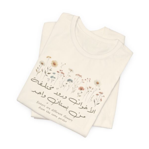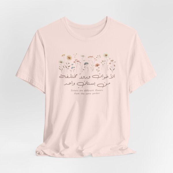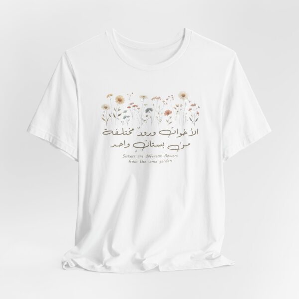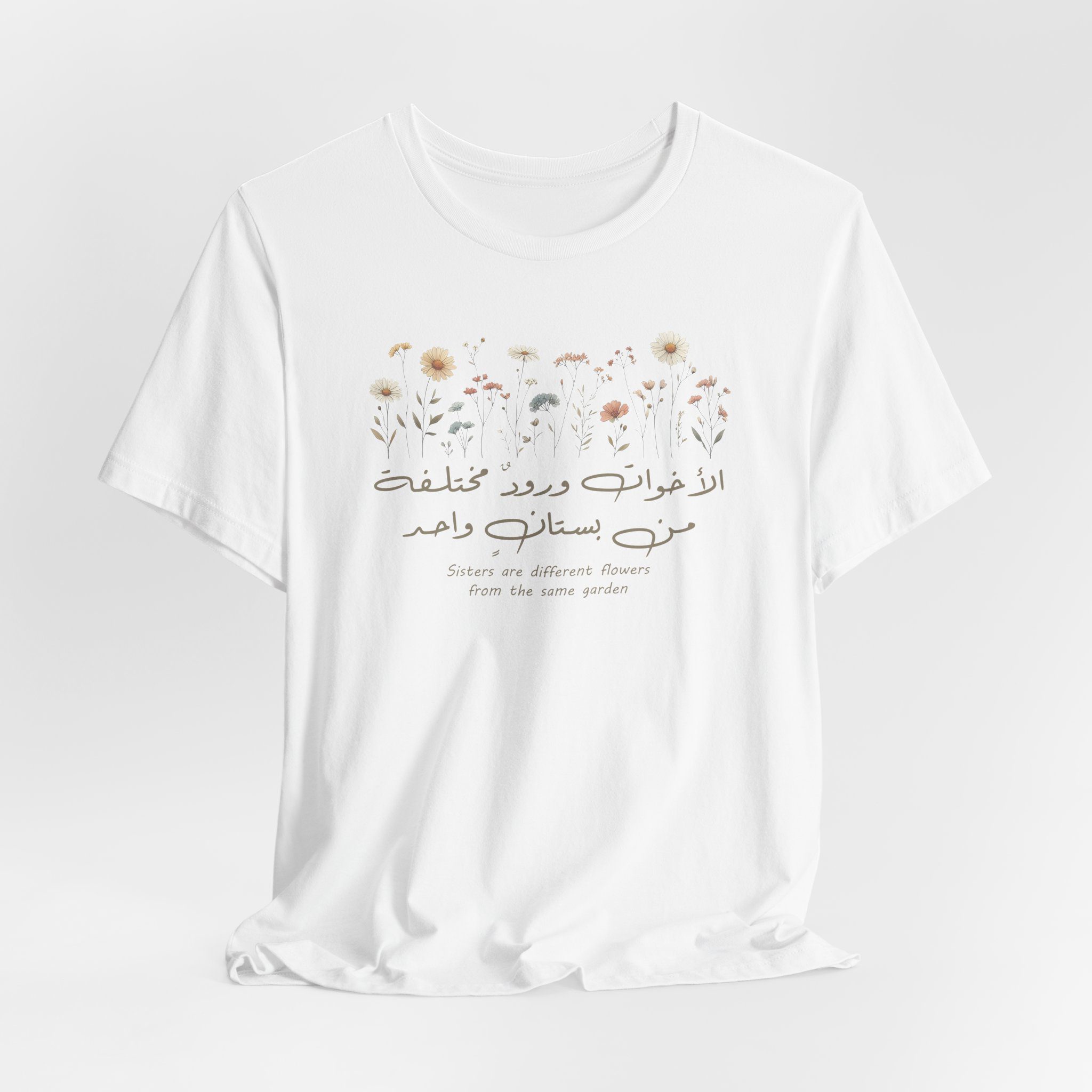 This Arabic sisters t-shirt captures the beauty of sibling bonds with delicate floral illustrations and a touching Arabic calligraphy quote. Its message reminds us that while sisters may be different, they blossom together from the same family roots.