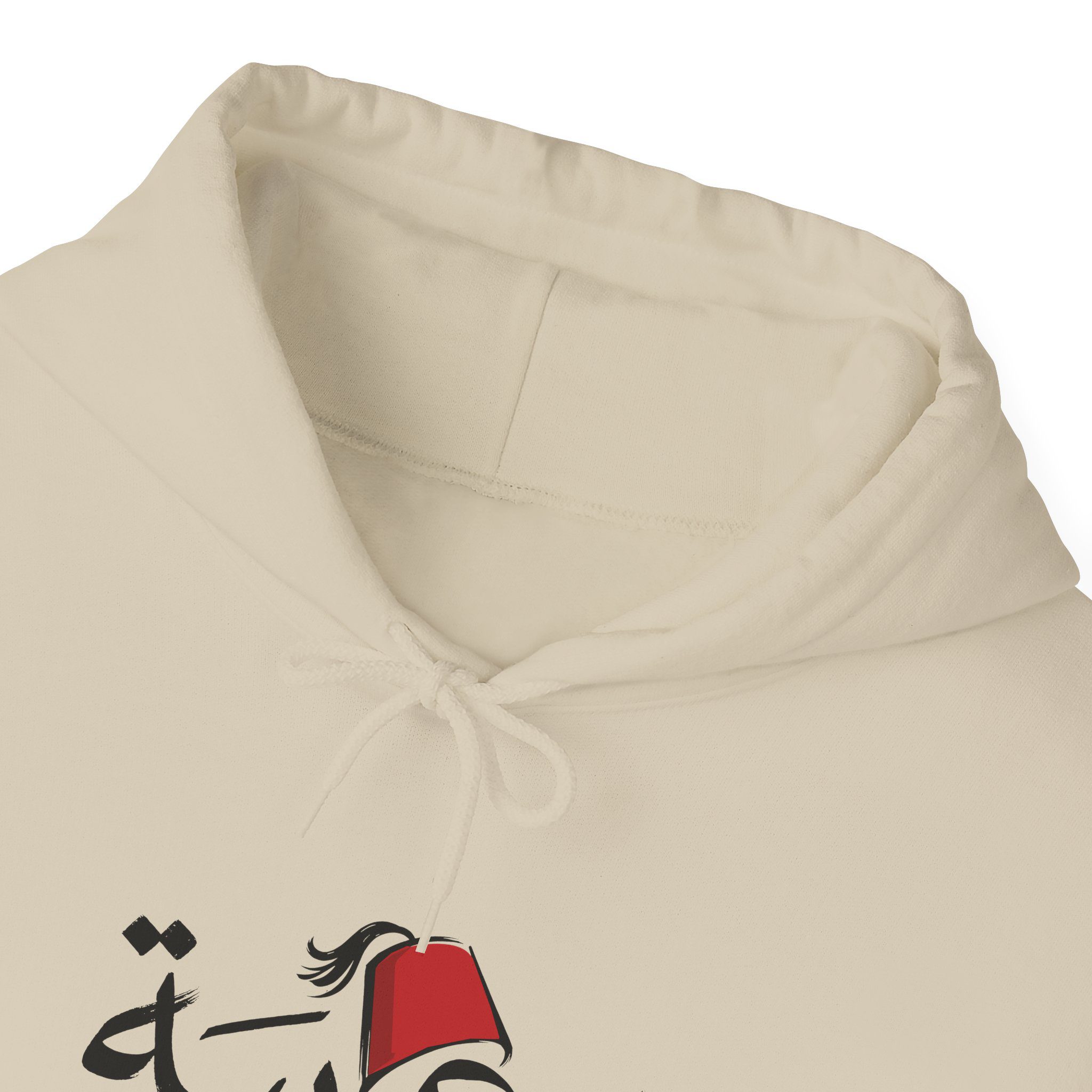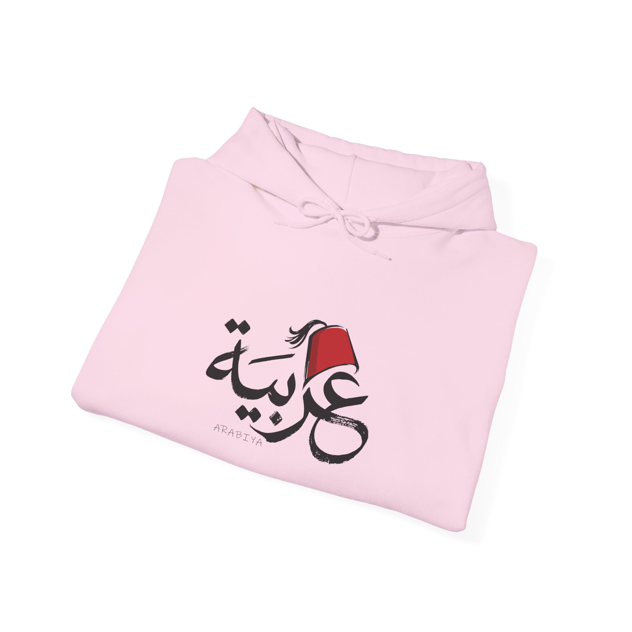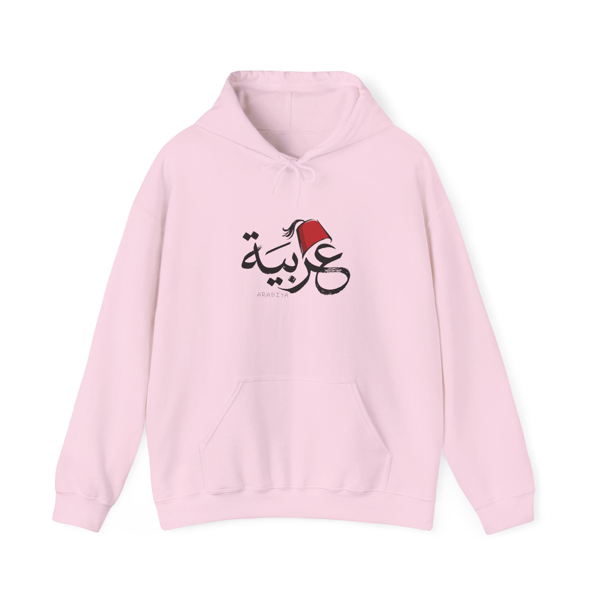 At the center of the hoodie is the Arabic word “عربية” (Arabiya), styled in an elegant contemporary lettering design. Above the lettering sits a red tarboosh, a traditional symbol closely tied to Arab heritage and culture. The mix of modern typography with this iconic cultural element creates a design that feels proudly Arab.