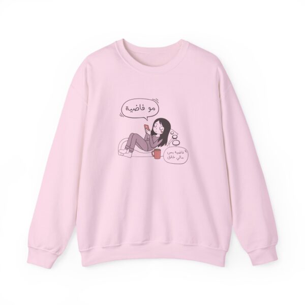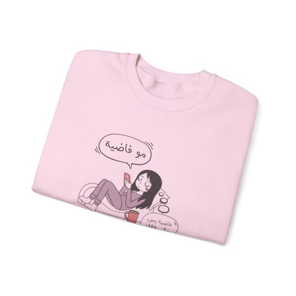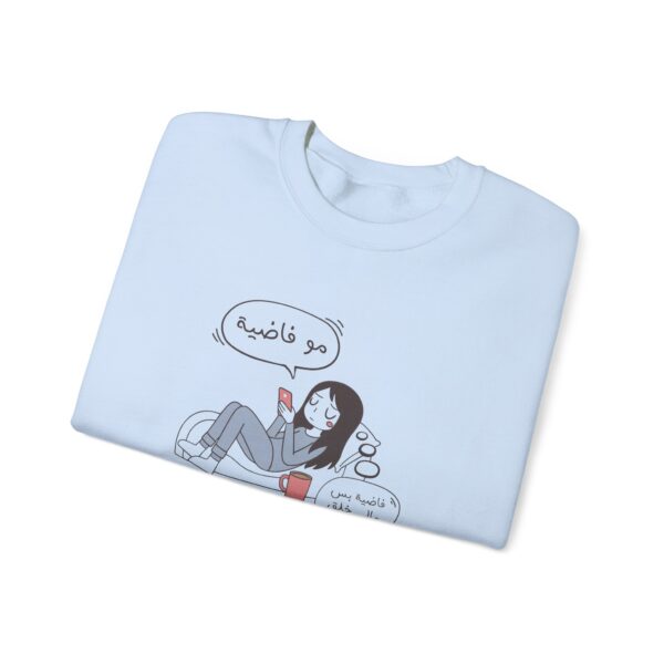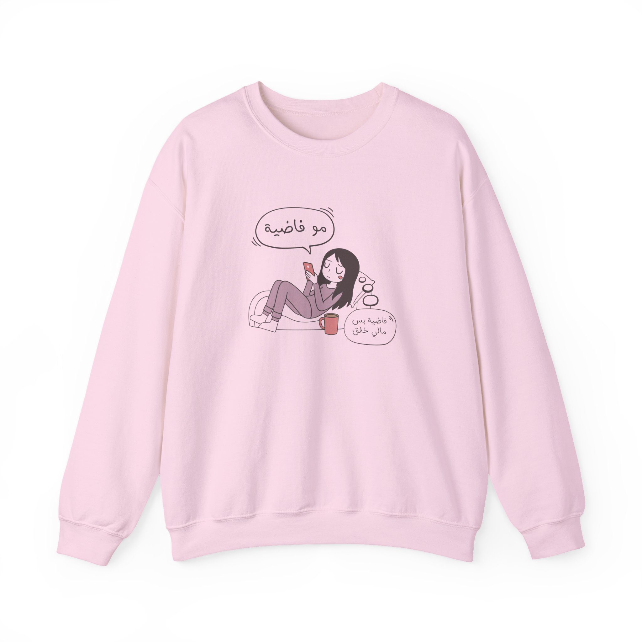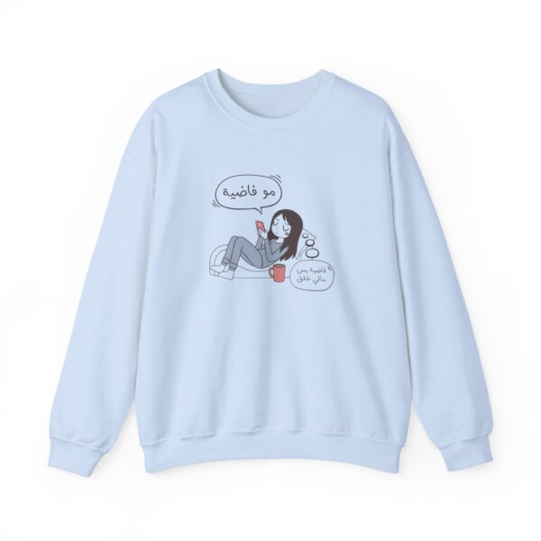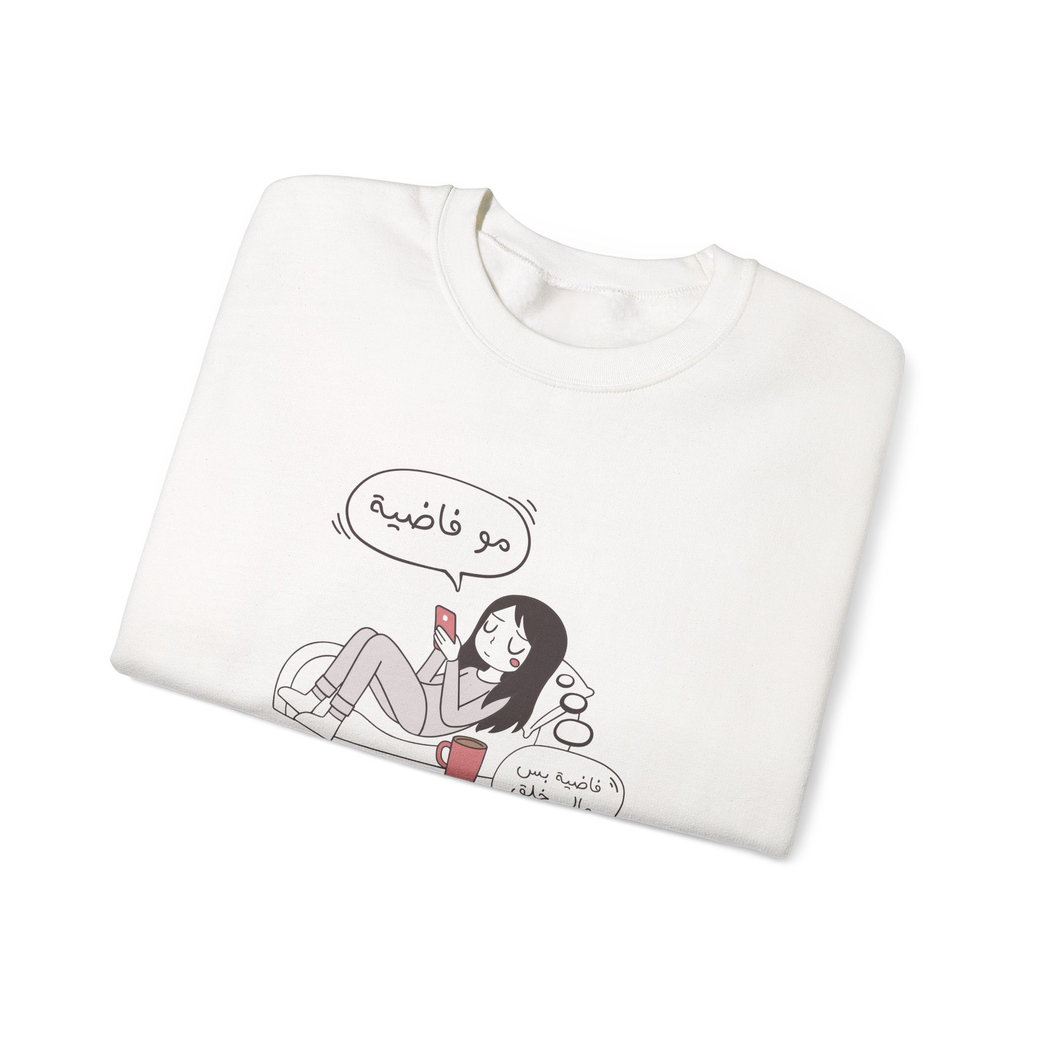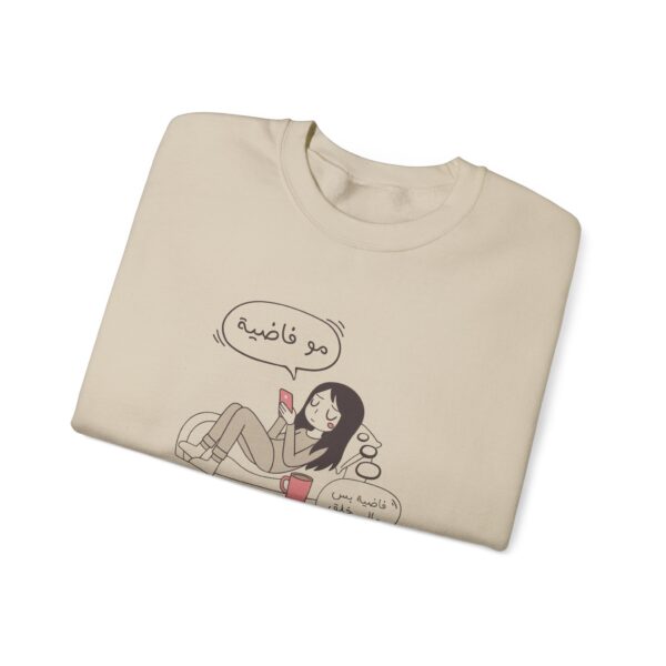 This funny Arabic sweatshirt for women is all about comfort and a touch of humor. The design shows a relaxed girl lounging with her phone, coffee in hand, and the witty Arabic phrase “مو فاضية” (“Not free”) – when you’re not actually busy, but you just need your space. a playful nod to lazy days when you just don’t feel like doing much.