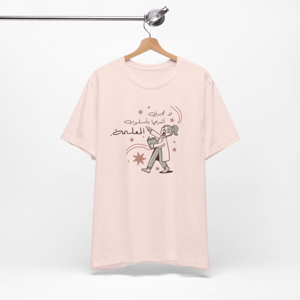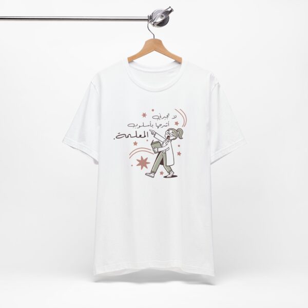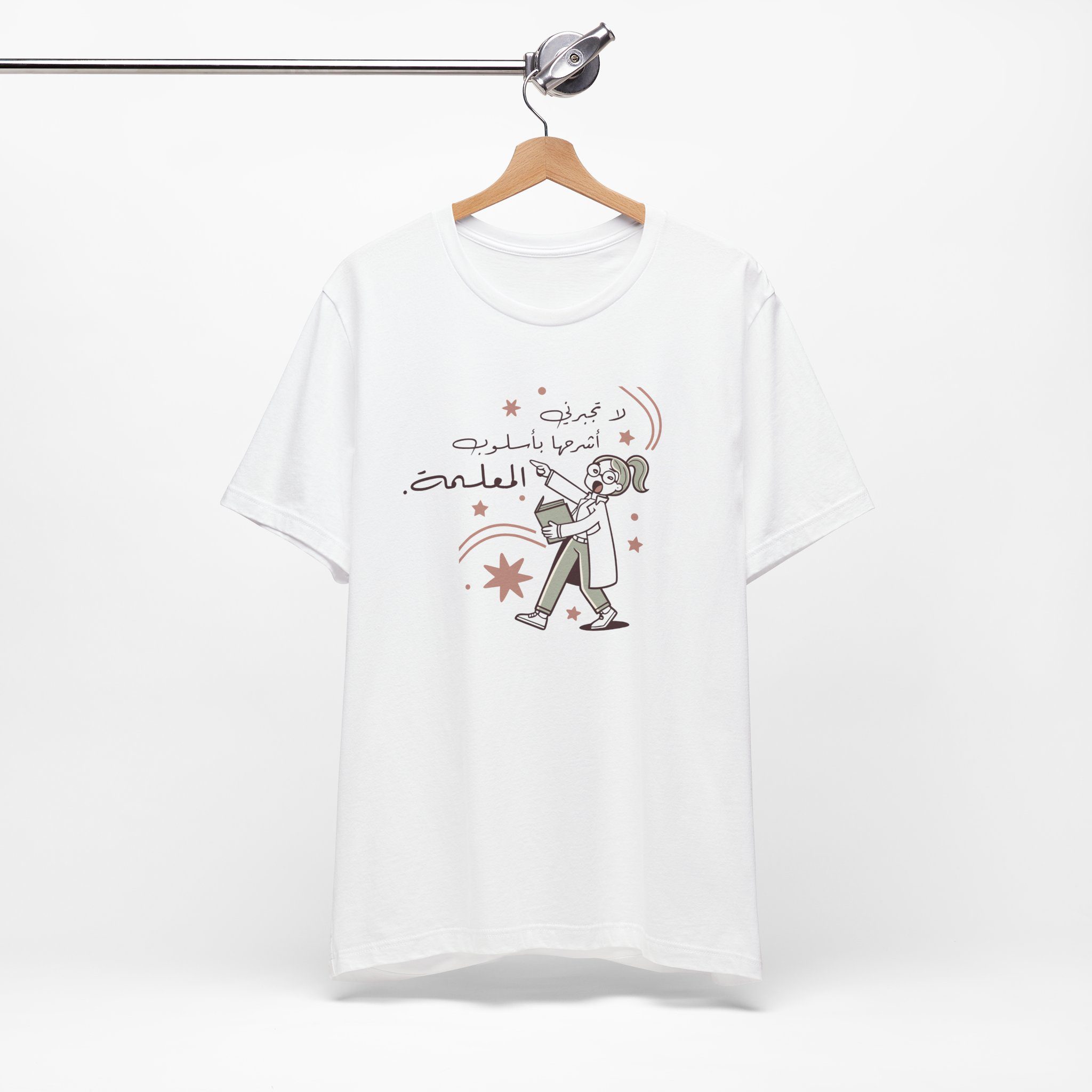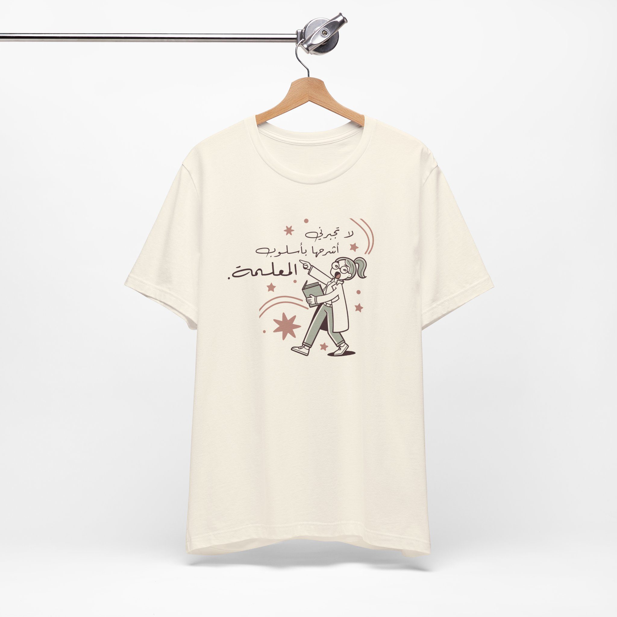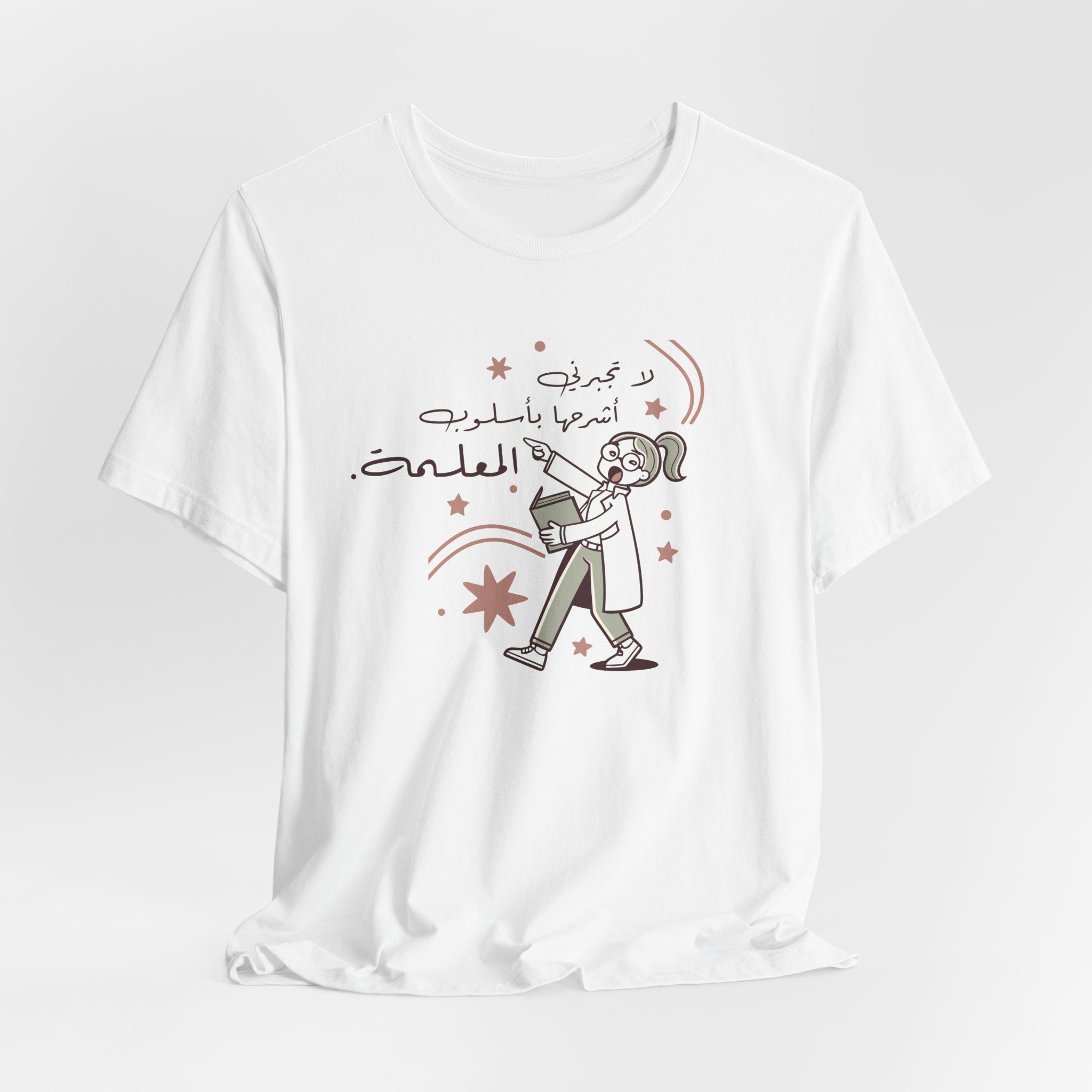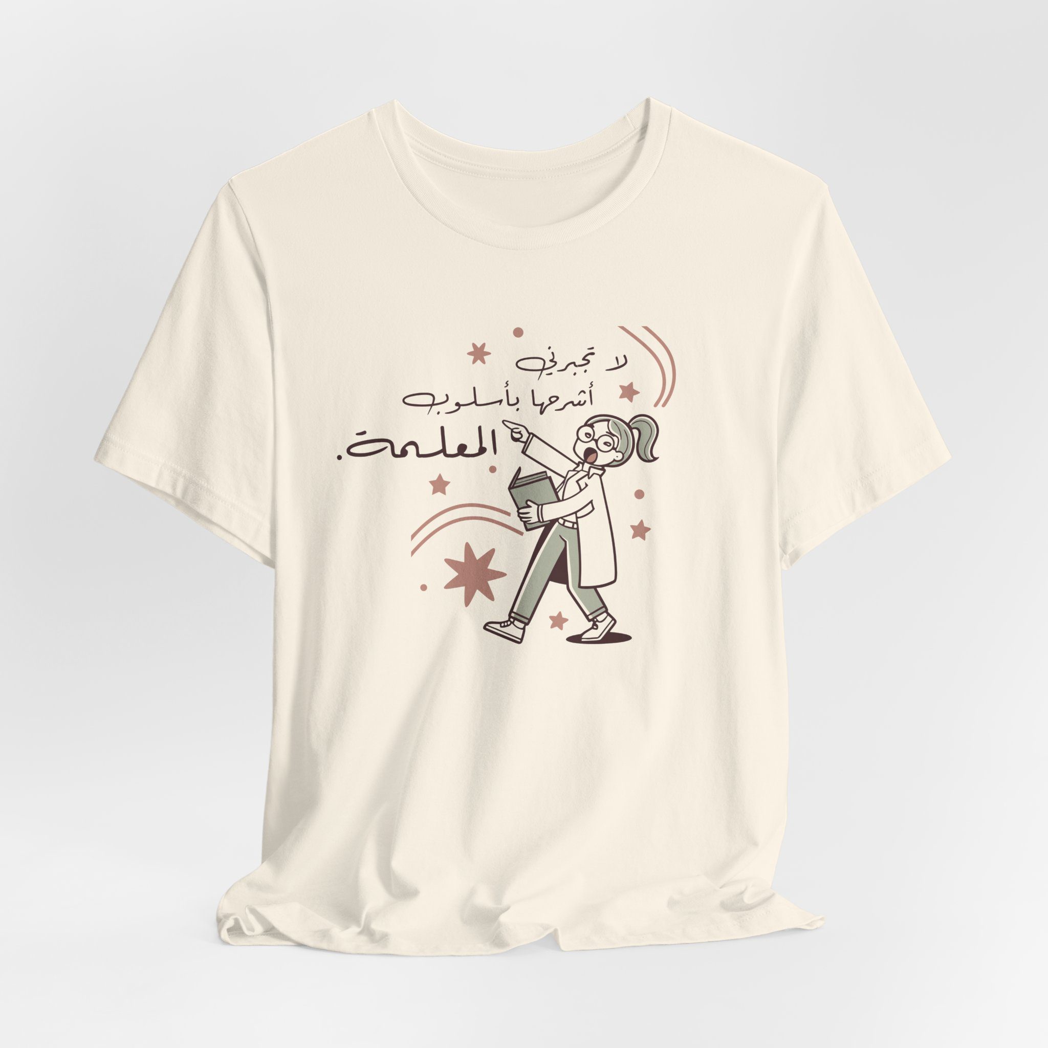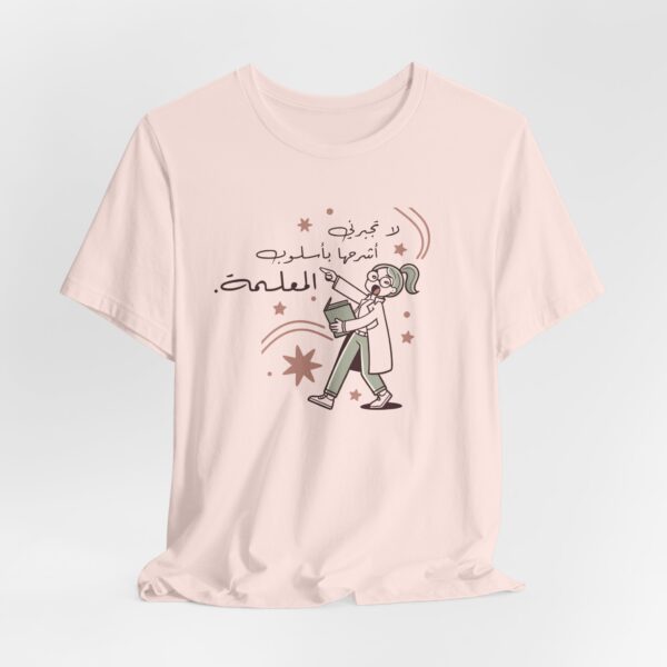 The design features a quirky cartoon teacher holding a book with playful stars around her, alongside the Arabic saying “لا تجبرني اشرحها باسلوب المعلمة” — meaning “Don’t make me explain it in a teacher’s way.” A witty nod to every teacher’s unique style of making a point clear.