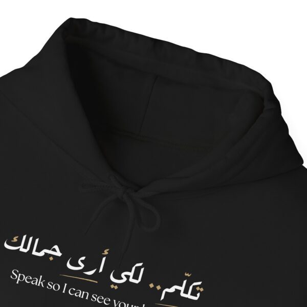 Adorn yourself with the essence of wisdom and elegance with our “Speak So I Can See Your Beauty” hoodie. Features a poetic Arabic saying “تكلم.. لكي أرى جمالك”, artfully styled in traditional calligraphy, paired with its English translation, with two carefully underlined words that draw attention to its poetic meaning.